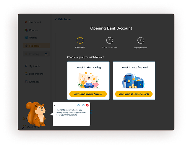All three users tried to bypass the “Opening Bank Account” portion of our tutorial by clicking “next” in the speech bubble, prompting SQUIRREL to encourage them to choose which type of bank account to open. At this point, two of the three test users reported that they didn’t know enough about the types of accounts to make this choice.