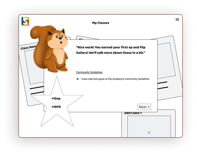 Ideation & Solution: Reading community guidelines (rules) is a prime spot to lose engagement with young users. It is also a business requirement. To minimize drop-off at this step, we chose to incorporate a cartoon squirrel character as a guide. Later in the ideation process, this squirrel would become students’ guide through our tutorial flow, adding some humor and fun. Additionally, we added gamification to this step of onboarding, rewarding users with experience points and in-site currency (Flip Dollars) as a reward.
